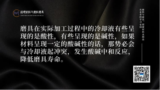 磨具在实际加工过程中的冷却液有些呈现的是酸性,有些呈现的是碱性,如果材料呈现一定的酸碱性的话,那势必会与冷却液起冲突,发生酸碱中和反应,降低磨具寿命。